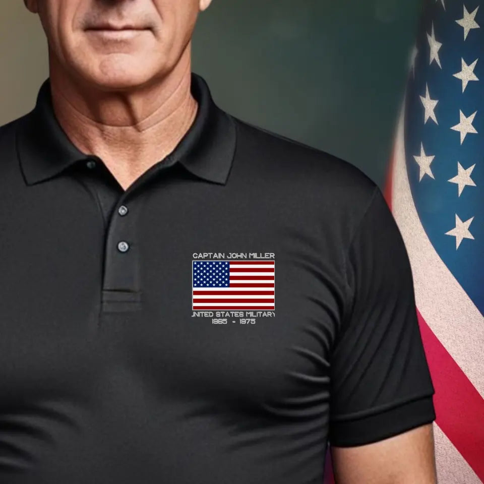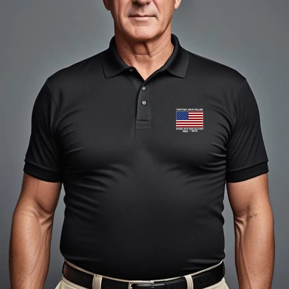 Show your pride with this personalized Veteran polo shirt. Celebrate your service with our premium Veteran Polo Shirt, designed to honor the brave men and women who have dedicated their lives to protecting our nation. This high-quality polo shirt features the American flag proudly displayed, along with customizable options for your rank, title, and years of service.