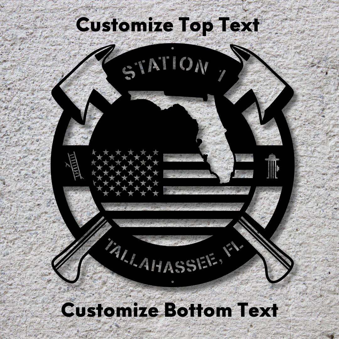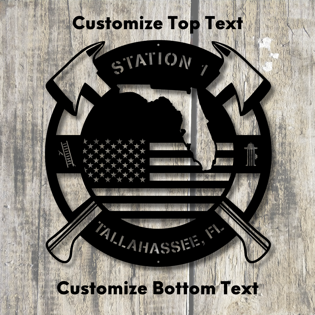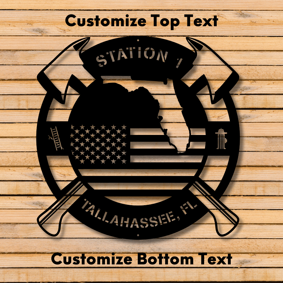 Personalized Florida Metal FireFighter State Map & American Flag Wall Sign