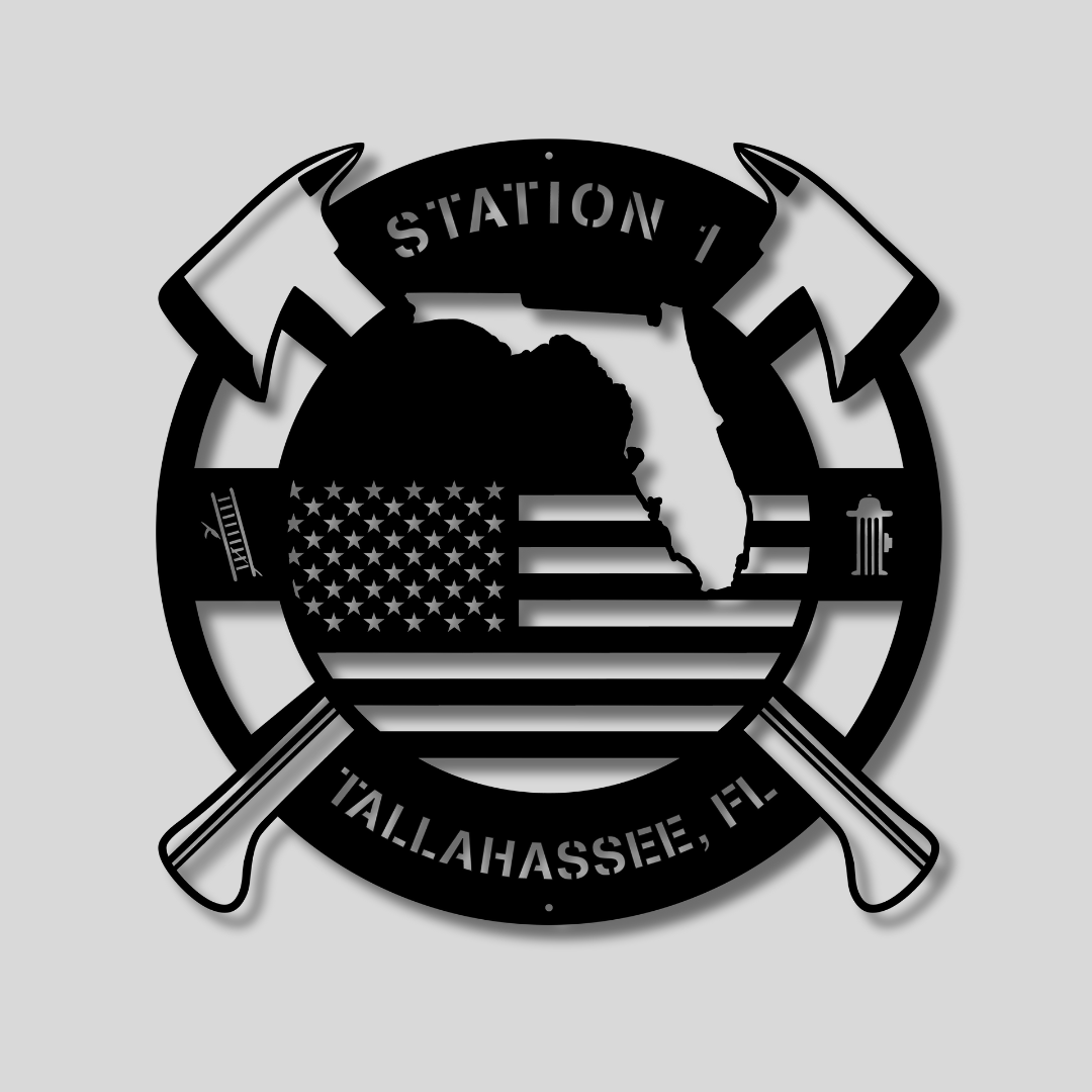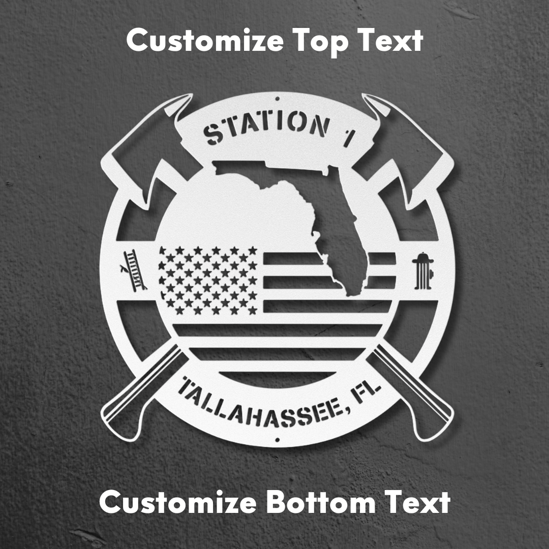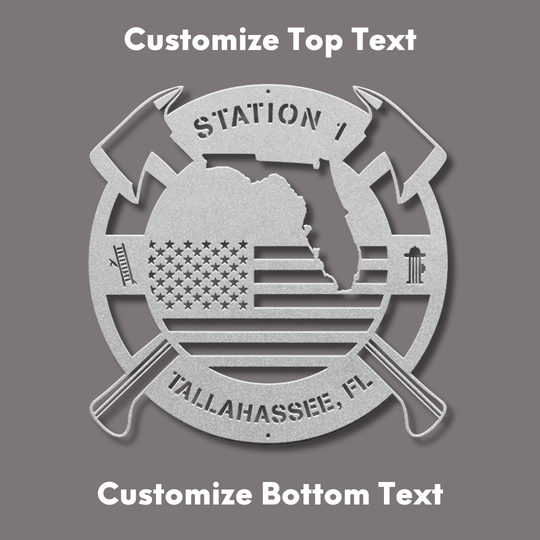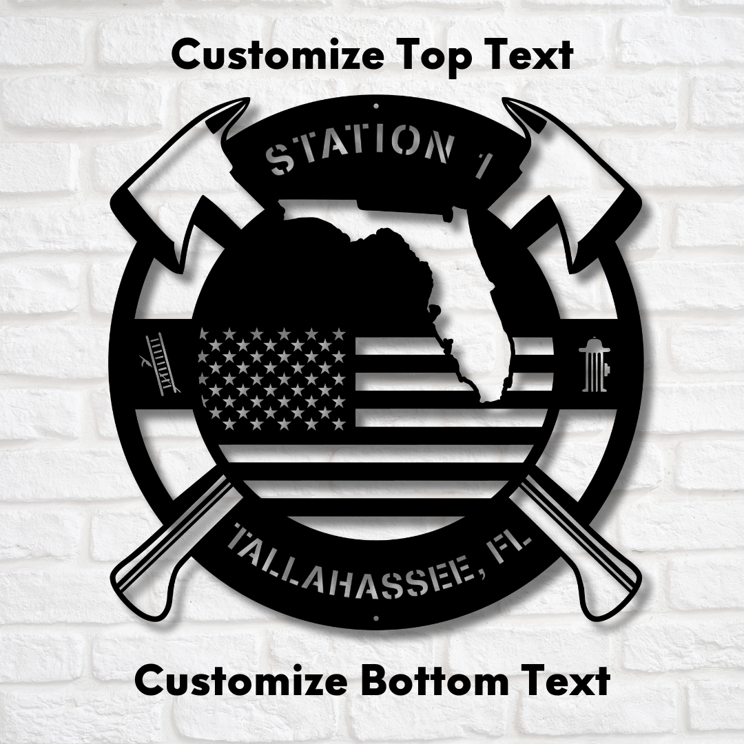 Personalized Florida Metal FireFighter State Map & American Flag Wall Sign