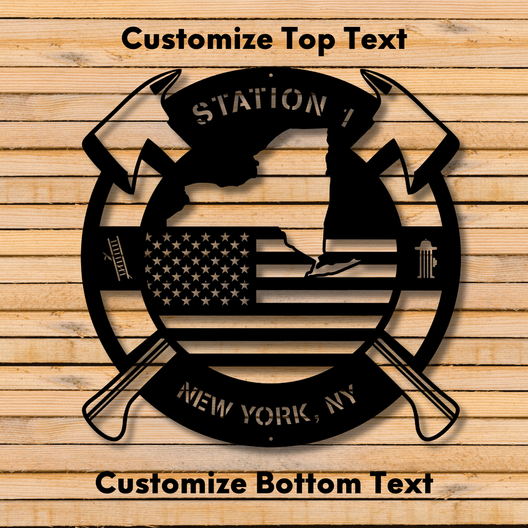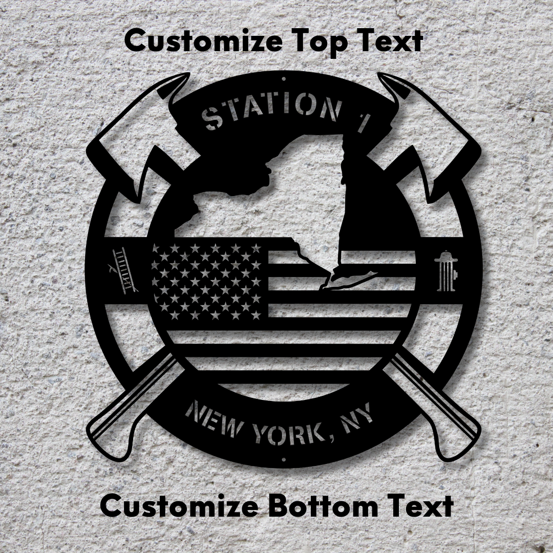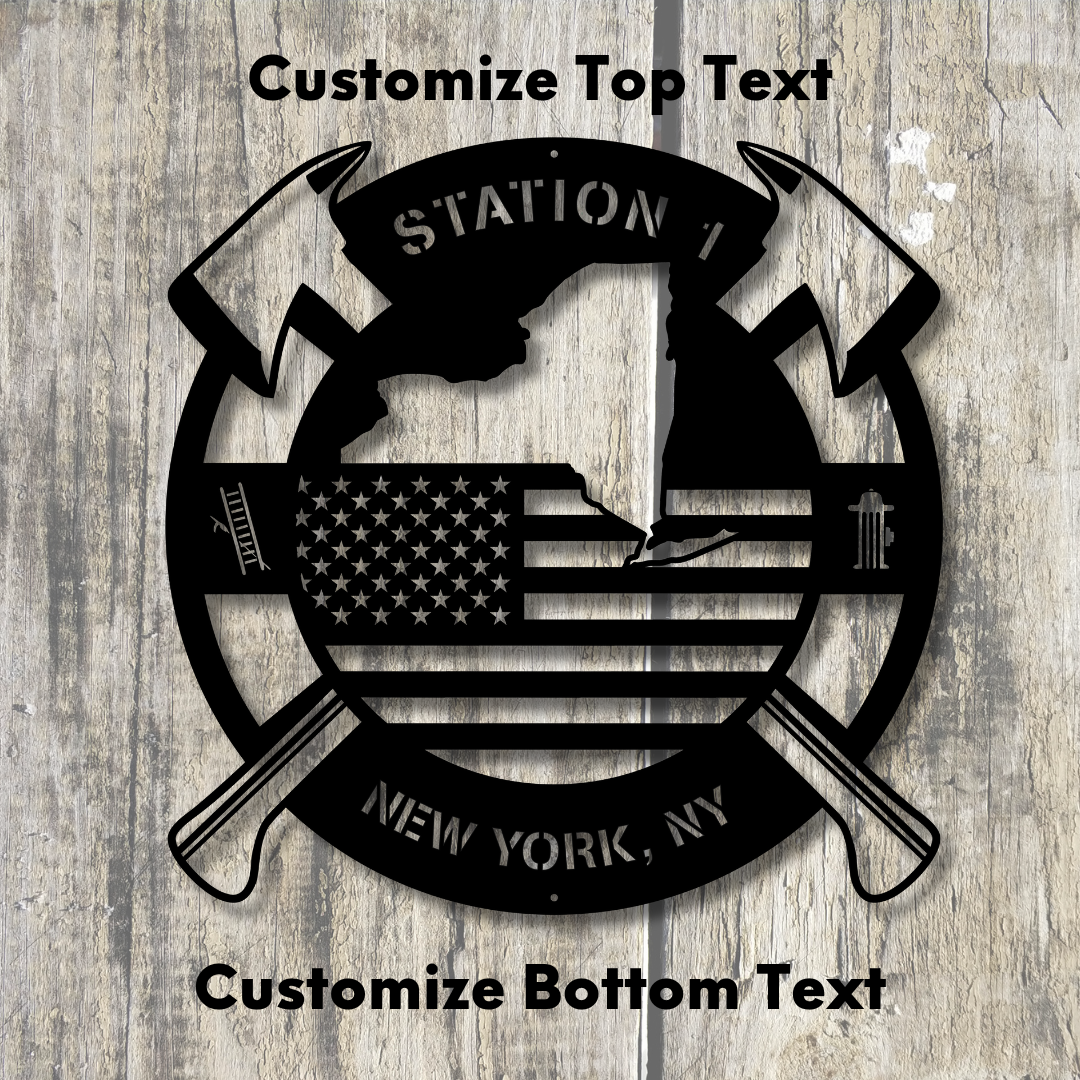 Personalized New York Metal FireFighter State Map & American Flag Wall Sign