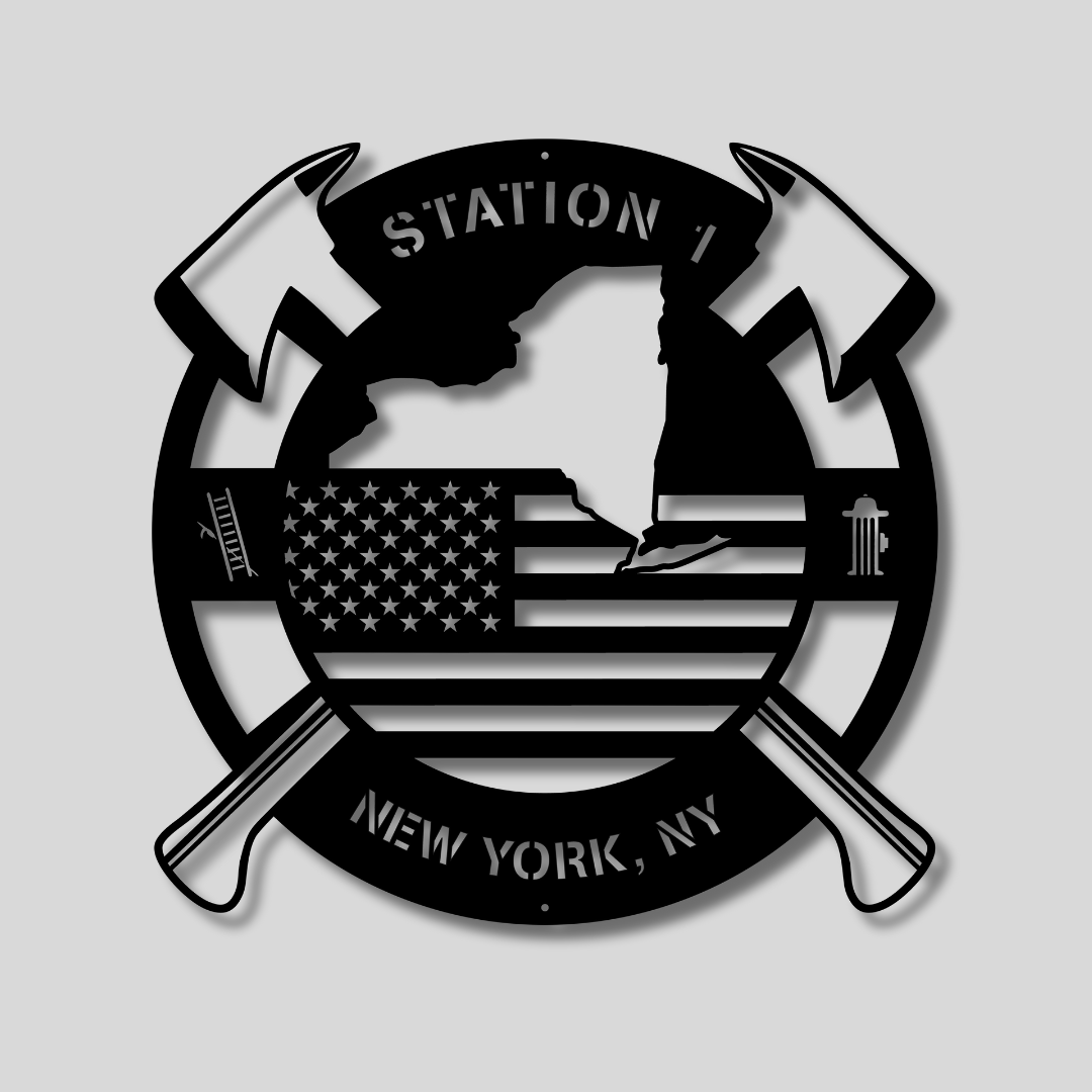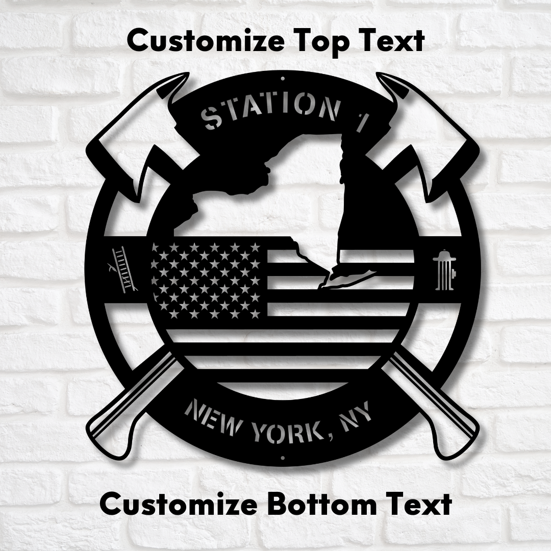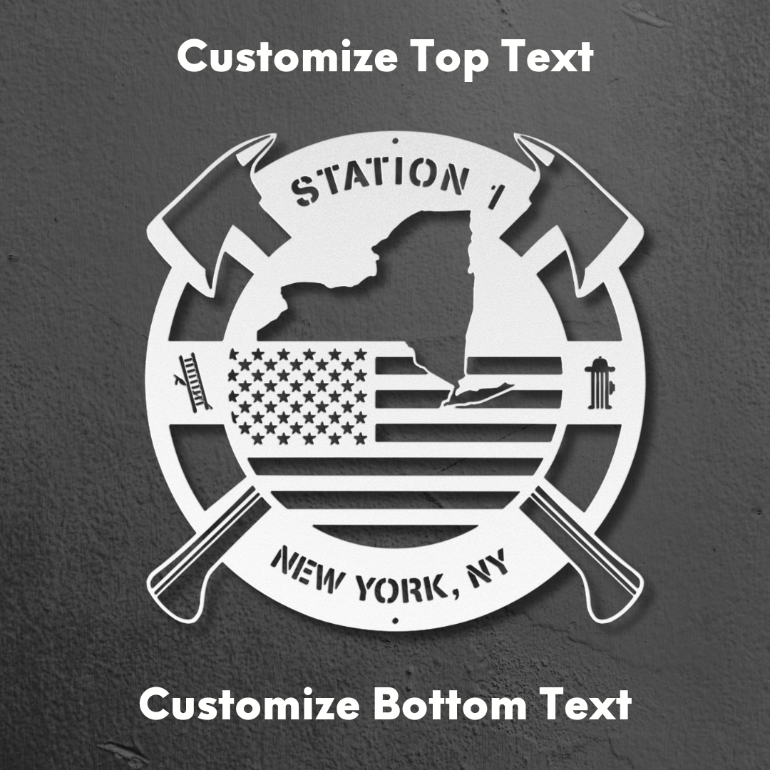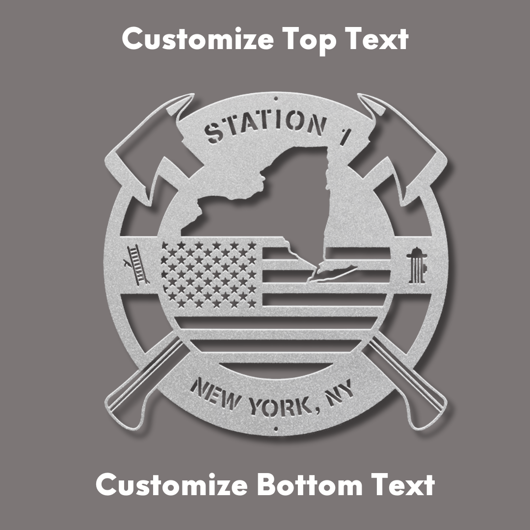Personalized New York Metal FireFighter State Map & American Flag Wall Sign